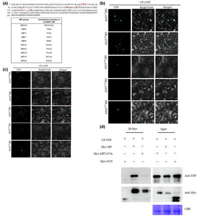 烟草花叶病毒属病毒(Tobamovirus)的运动蛋白(MP)和外壳蛋白(CP)分别在病毒细胞间和远距离运动中起着关键作用。黄瓜绿斑驳花叶病毒也是烟草花叶病毒属病毒。但是CGMMV MP和CP在病毒感染过程中的功能仍不清楚。通过该研究表明了CGMMV MP可以在体内与CP相互作用,MP中79–128位的氨基酸对MP–CP相互作用至关重要。为了证实这一发现,作者突变了残基79–128区域内的五个保守残基和该区域侧翼的六个其他保守残基,随后进行了体内相互作用分析。结果表明,MP(MPT107)中107位的保守苏氨酸残基对MP–CP相互作用很重要。用丙氨酸替代T107(MPT107A)延缓了烟草中CGMMV的全身感染,但增加了CGMMV局部积累。另外10个保守残基的取代(不负责MP–CP相互作用)与丙氨酸抑制或消除了CGMMV系统感染,表明这10个保守的残基可能是通过独立于CP的方式参与系统运动功能。此外,两个运动功能相关的点突变体(MPF17A和MPD97A)未能在植物中引起系统感染,而不会影响MP–CP相互作用。此外,作者发现CGMMV MP和CP的共表达增加了CP的积累,与相互作用无关。MP和CP相互作用在感染早期抑制水杨酸相关的防御反应。
