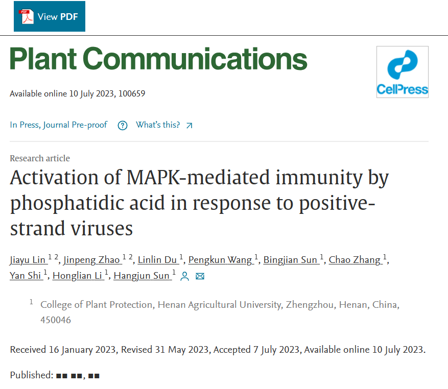 李洪连教授团队题为《Activation of MAPK-mediated immunity by phosphatidic acid in response to positive-strand RNA viruses》的研究论文。论文揭示了植物如何激活MAPK途径以抵抗病毒侵染。