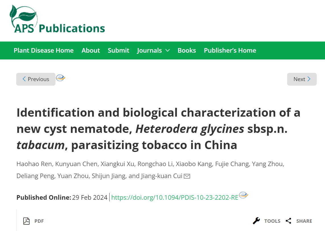 蒋士君教授/崔江宽副教授团队在《Plant Disease》上发表题为“Identification and biological characterization of a new cyst nematode, Heterodera glycines sbsp.n. tabacum, parasitizing tobacco in China”的研究论文。论文新发现了一种严重危害烟草生产的作物孢囊线虫新种。全文链接//doi.org/10.1094/PDIS-10-23-2202-RE