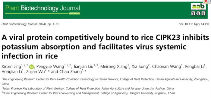 李洪连教授团队/张超教授课题组与福建农林大学吴祖建研究员团队联合在国际著名学术期刊《Plant Biotechnology Journal》在线发表了题为“A viral protein competitively bound to rice CIPK23 inhibits potassium absorption and facilitates virus systemic infection in rice”的研究论文。该研究报道了水稻草状矮化病毒(rice grassy stunt virus,RGSV)P1蛋白抑制水稻K+吸收并促进病毒系统侵染的功能。
