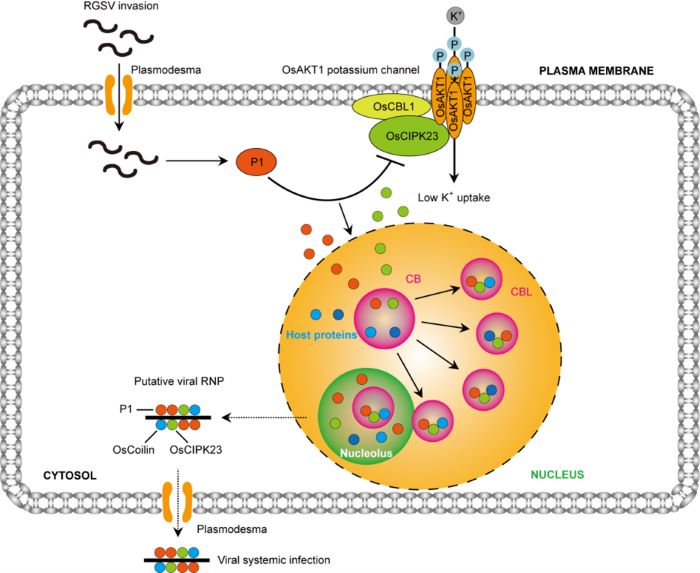 进一步研究发现,P1蛋白能够与Shaker类型K+通道蛋白OsAKT1的上游调节因子OsCIPK23互作并将其招募到细胞核卡哈尔体(Cajal bodies,CBs),增强OsCIPK23与CB核心组分Coilin的结合,并促进它们通过这些CB结构运输。这一过程可能是RGSV系统侵染水稻的重要环节,但影响了OsCIPK23-OsAKT1在调控水稻对K+吸收中的功能,导致水稻对K+吸收受到抑制(图2)。该研究从植物营养角度解析了RGSV的致病机制,提出了水稻病毒致病过程的新见解,为开展水稻抗病毒分子育种提供了潜在靶标。