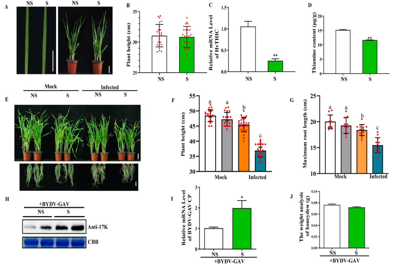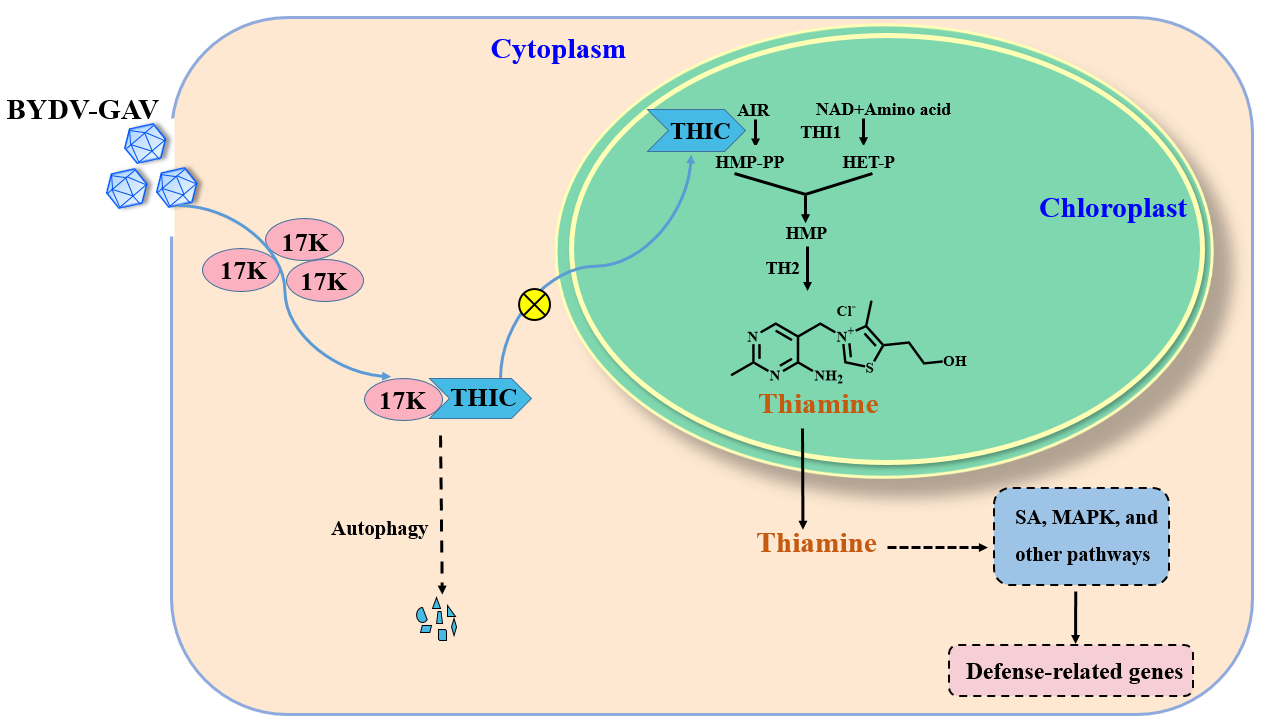 硫胺素(Thiamine)是调节植物健康和逆境胁迫的重要激活因子。然而,硫胺素在调节植物病毒侵染中的作用知之甚少。本文报道了大麦黄矮病毒GAV株系 (BYDV-GAV)编码的多功能蛋白17K与大麦嘧啶合酶(HvTHIC)相互作用,后者是硫胺素生物合成的关键酶,HvTHIC通过N端74个氨基酸定位在叶绿体中,17K-HvTHIC相互作用阻碍了HvTHIC靶向叶绿体,并引发了自噬介导的HvTHIC的降解。在BYDV-GAV侵染大麦后,HvTHIC基因的表达显著上调,并伴有硫胺素和水杨酸(SA)的积累,沉默HvTHIC促进了BYDV-GAV的系统侵染(图1),硫胺素处理显著增强大麦对BYDV-GAV的抗性。