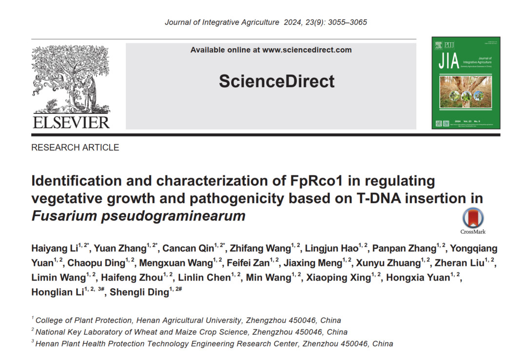 李洪连教授团队完成的题为“Identification and characterization of FpRco1 in regulating vegetative growth and pathogenicity based on T-DNA insertion in Fusarium pseudograminearum”的研究论文在Journal of Integrative Agriculture (《农业科学学报》(英文),JIA,中国科学院一区top期刊)上正式发表。