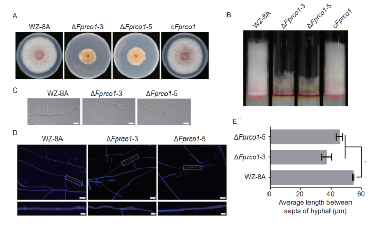 蛋白质乙酰化在调节生物过程中起着重要的作用,在酵母中Rpd3组蛋白去乙酰化酶(HDAC)复合物,包括Rpd3L和Rpd3S两个复合体亚基,其在真核生物中与转录抑制有关。该团队前期研究发现,在假禾谷镰孢中Rpd3复合体大亚基的组分FpDep1对病原菌的生长发育及致病机制是必需的(Zhang et al., 2020),但Rpd3复合体小亚基调控假禾谷镰孢侵染的机制仍有待探索。本研究表明,假禾谷镰孢Rpd3S复合体组分FpRco1在病原菌生长及致病中同样发挥着重要作用。FpRCO1基因敲除突变体表现出营养生长缺陷,分生孢子产孢量减少,在小麦胚芽鞘及大麦叶片的致病力降低,而回补菌株恢复了这些表型。进一步研究表明,在胁迫条件下,与野生型菌株相比FpRCO1缺失突变体对氯化钠、山梨醇和SDS的敏感性增加,但对过氧化氢的敏感性降低。