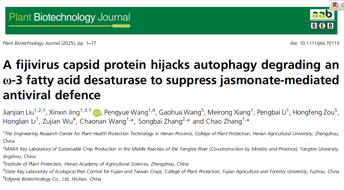 李洪连教授团队/张超教授课题组在植物学权威期刊《Plant Biotechnology Journal》(IF2024=11.2)在线发表了题为“A fijivirus capsid protein hijacks autophagy degrading an ω-3 fatty acid desaturase to suppress jasmonate-mediated antiviral defence”的研究论文。该研究通过代谢组学分析发现,水稻黑条矮缩病毒(rice black-streaked dwarf virus,RBSDV)侵染后,水稻叶片中不饱和脂肪酸(Unsaturated fatty acid, UFAs)含量显著降低,其中茉莉酸(jasmonic acid, JA)生物合成前体α-亚麻酸(C18:3)的减少尤为突出。进一步研究表明,RBSDV外壳蛋白P10能够直接与水稻脂肪酸去饱和酶7(fatty acid desaturase 7, FAD7)相互作用,并通过自噬途径促进OsFAD7的降解,从而抑制C18:3及JA的积累,削弱植物的抗病防御反应。本研究揭示了病毒通过劫持自噬系统干扰脂肪酸代谢,进而抑制JA信号通路的分子机制,不仅深化了对病毒-寄主互作的理解,也为抗病毒作物育种和新型抗病毒策略的开发提供了重要的理论依据。