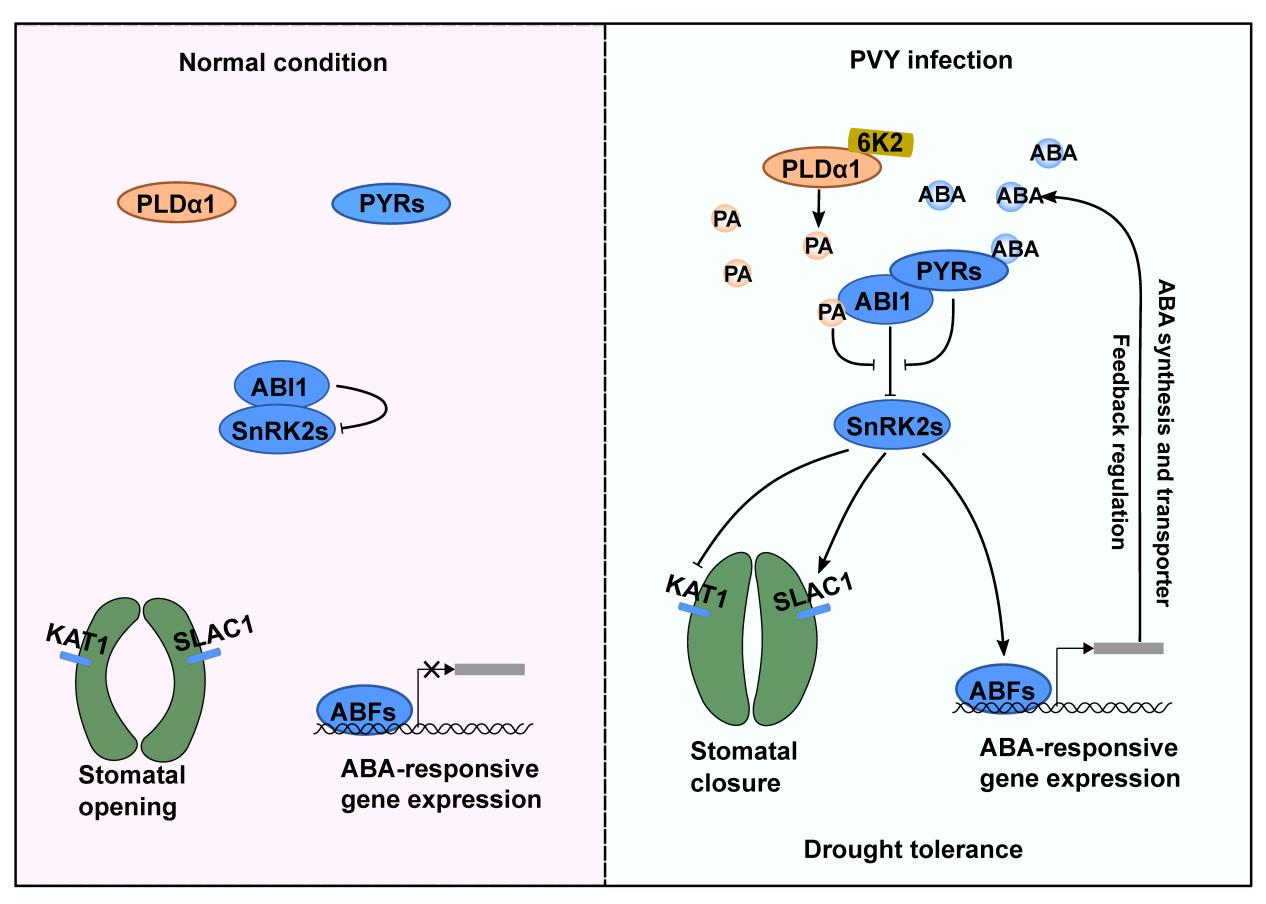 李洪连教授团队|孙炳剑教授、孙航军副教授课题组在国际著名期刊《Plant Cell & Environment》上发表了题为“+RNA viruses enhance plant drought tolerance through modulation of phospholipase Dα1 (PLDα1)-derived phosphatidic acid (PA)”的研究论文。该研究发现+RNA病毒通过调控磷脂酶Dα1(PLDα1)及其产物磷脂酸激活脱落酸信号途径,从而增强植物抗旱能力。