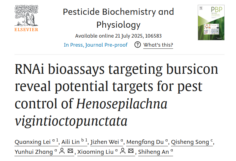 安世恒教授团队在中国科学院一区TOP期刊《Pesticide Biochemistry and Physiology》发表了题为“RNAi bioassays targeting bursicon reveal potential targets for pest control of Henosepilachna vigintioctopunctata”的研究论文,研究揭示茄二十八星瓢虫发育关键基因,为RNA干扰新型生物农药开发提供靶点。