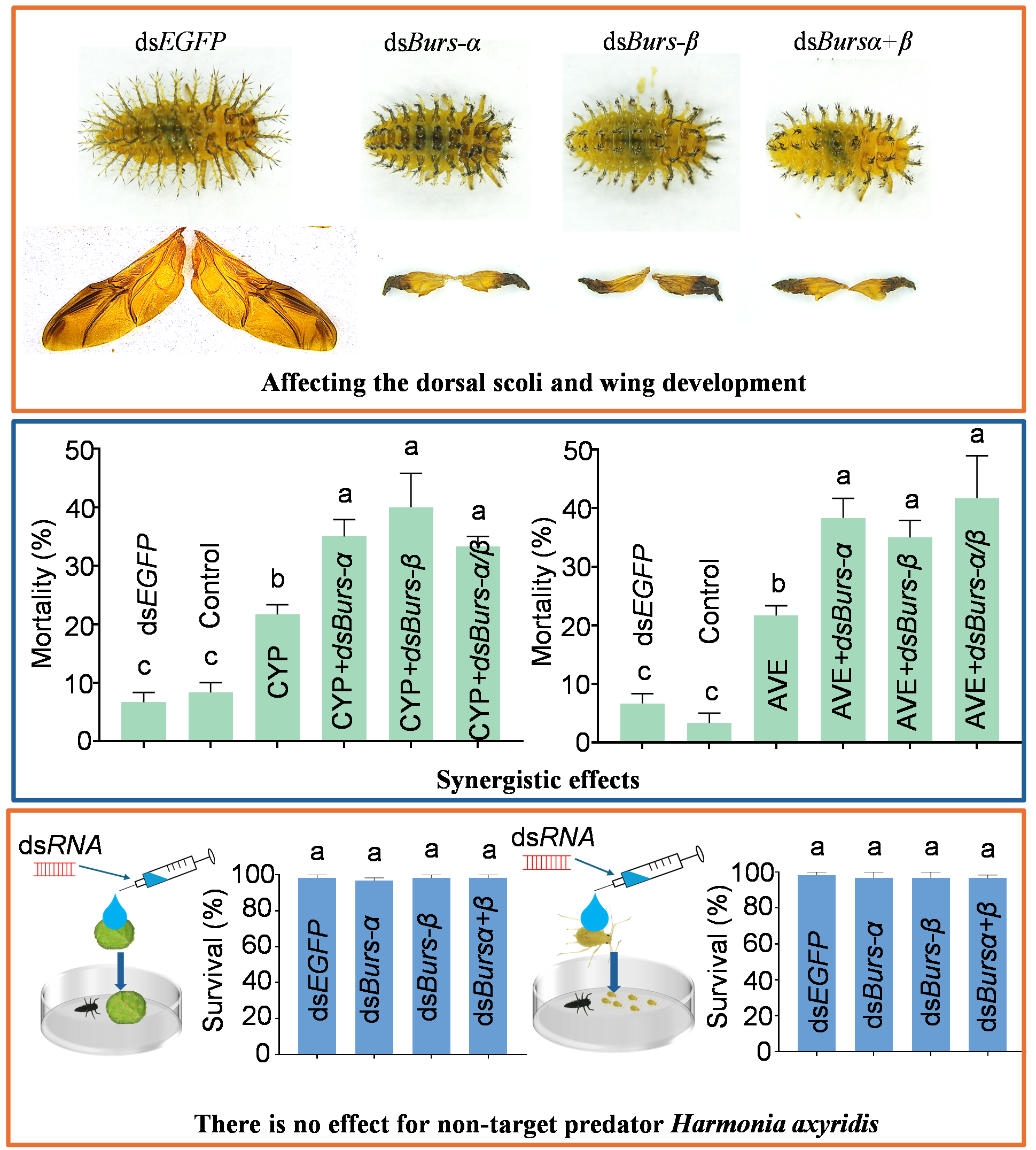 此外,将Bursicon的两个亚基的dsRNA与阿维菌素或高效氯氰菊酯等化学杀虫剂联用,可显著提高幼虫死亡率,并进一步抑制其化蛹与羽化过程。令人鼓舞的是,HvBurs-α和 HvBurs-β靶向RNAi对捕食性瓢虫——异色瓢虫(Harmonia axyridis)并无显著不良影响,显示出良好的生物安全性。该研究为绿色、可持续的害虫防控策略提供了新的方向,也为控制其迁飞性行为提供了理论依据和技术支持。