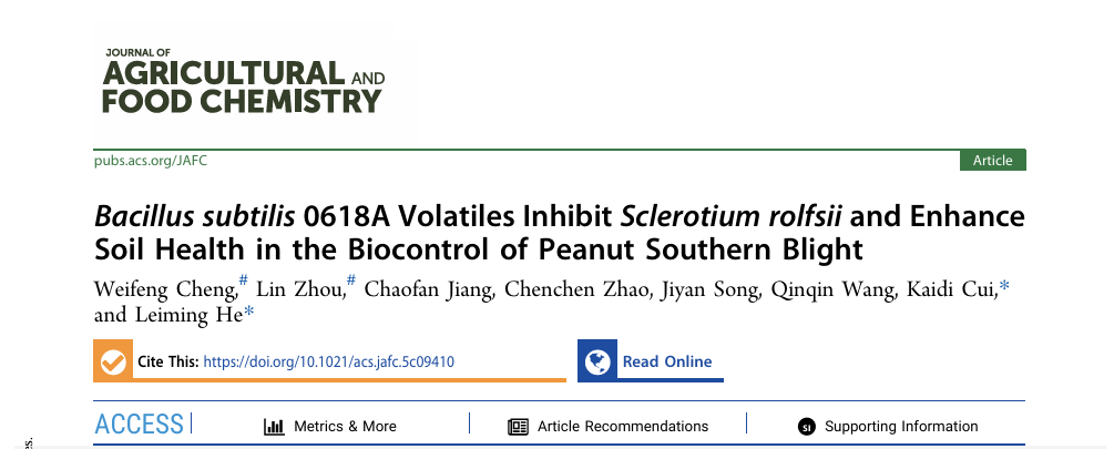 周琳教授团队在中科院一区TOP期刊《Journal of Agricultural and Food Chemistry》上发表了题为“Bacillus subtilis 0618A Volatiles Inhibit Sclerotium rolfsii and Enhance Soil Health in the Biocontrol of Peanut Southern Blight”的研究论文。该研究系统评估了枯草芽孢杆菌0618A挥发性有机化合物(VOCs)防控花生白绢病的生物活性及生态安全性,并初步解析了VOCs及其主要活性成分2,4-二叔丁基苯酚(2,4-DTBP)的作用机制,为花生白绢病的绿色防控提供了新策略。