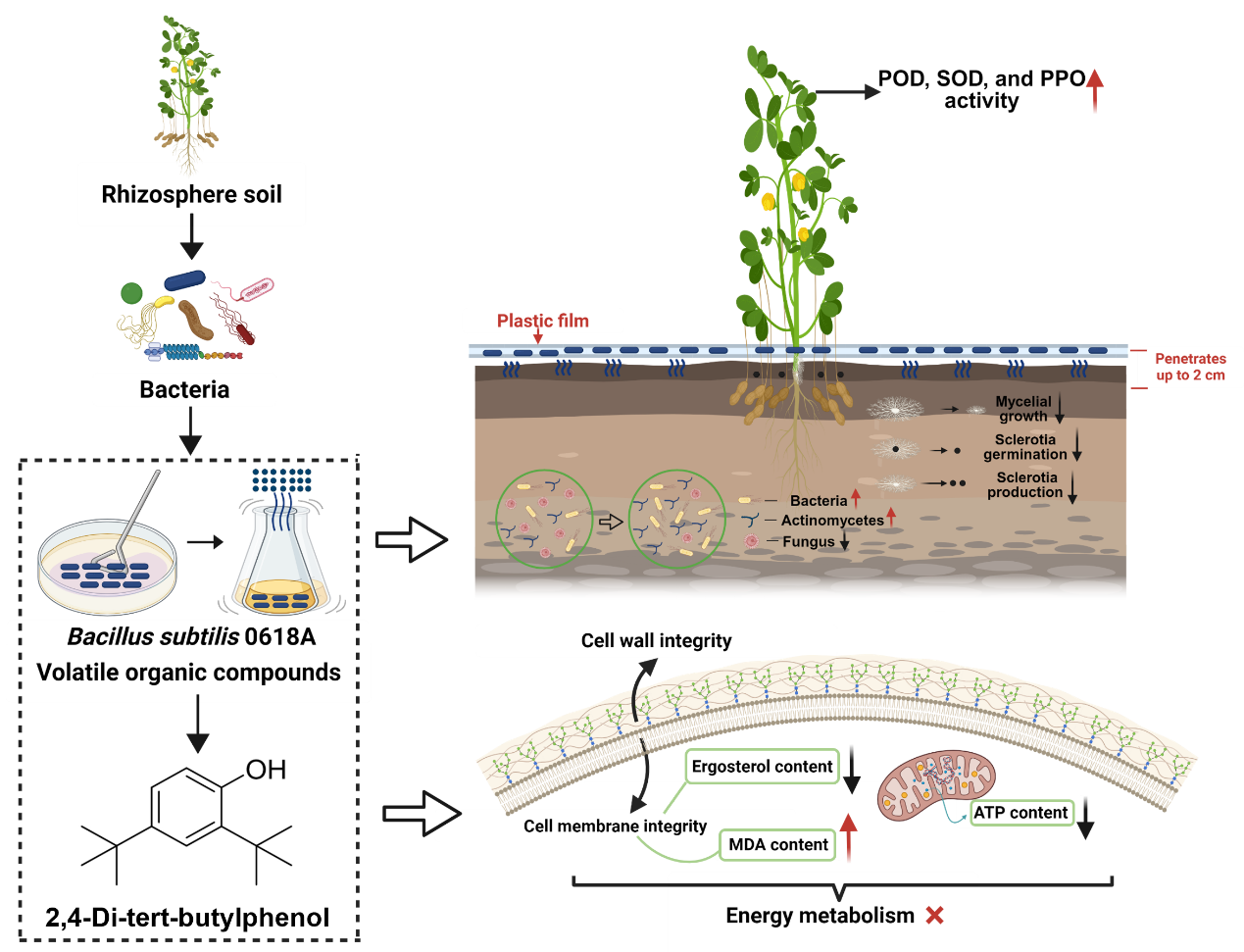 与直接施用生防菌相比,挥发性有机化合物(VOCs)具有更强的穿透能力和更广的作用范围。本研究显示,枯草芽孢杆菌0618A产生的VOCs在浓度为1×108 CFU/mL时可完全抑制白绢病菌的菌丝生长和菌核萌发。与常用化学杀菌剂相比,该VOCs 能有效穿透土壤(深度达2 cm),抑制菌核萌发,并增强花生SOD、POD 和 PPO等防御酶的活性,室内防治效果达到75.28%,显著优于戊唑醇(62.92%)和多抗霉素(46.07%)。VOCs 处理还显著增加了土壤细菌和放线菌的数量,并提高了蔗糖酶活性,从而优化了土壤微生态功能与健康。通过GC-MS和贡献值分析,明确2,4-DTBP为枯草芽孢杆菌产生的主要活性挥发物。进一步机制研究表明,VOCs和 2,4-DTBP 均能破坏白绢病菌细胞壁和细胞膜的完整性,降低线粒体膜电位,阻断 ATP 合成,最终导致病原真菌死亡。该研究为花生白绢病的绿色防控提供了新思路,并为枯草芽孢挥发物的开发与应用奠定了理论基础。