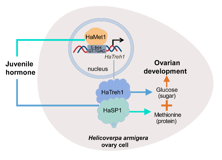 棉铃虫(Helicoverpa armigera)作为重要的农业害虫,其雌蛾必须取食糖类(如花蜜或露水)才能完成卵巢发育,强大的繁殖能力是造成严重危害的关键。本文以棉铃虫为研究材料,以海藻糖酶1(Treh1)为研究切入点,解析其在卵巢发育中介导JH与营养信号交叉互扰中的作用。结果显示,无糖或无酪蛋白饲料均会抑制雌虫卵巢发育并降低JH滴度。HaTreh1的活性在糖饥饿或JH处理下上调,而在无酪蛋白饲料处理下降低。利用RNAi敲低HaTreh1转录会严重阻碍卵巢生长,表型为输卵管长度缩短、卵粒数减少、卵巢比重下降以及产卵量降低。机制解析数据显示,转录因子Methoprene-tolerant 1(Met1)通过结合HaTreh1启动子中E-box(GTTGAC)元件直接激活HaTreh1的转录。此外,HaTreh1在JH诱导下与富含甲硫氨酸的储存蛋白1(HaSP1)发生直接结合,而敲低HaSP1会因甲硫氨酸缺乏延迟卵巢生长。综上所述,JH通过调控HaTreh1的转录和蛋白活性来控制海藻糖与甲硫氨酸水平,进而协调卵巢发育。该研究首次系统揭示JH通过Met1–Treh1–SP1信号轴整合糖与氨基酸代谢以促进卵巢发育的分子机制。