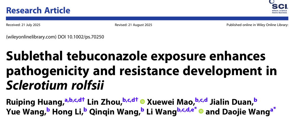 周琳教授团队在中国科学院一区TOP期刊《Pest Management Science》发表了题为“Sublethal tebuconazole exposure enhances pathogenicity and resistance development in Sclerotium rolfsii”的研究论文。该研究系统评估了三唑类杀菌剂戊唑醇对花生白绢病菌的毒理学效应,为该药剂的科学使用和花生白绢病的精准防控提供了重要理论依据。