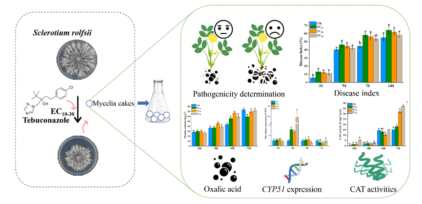 然而,目前关于戊唑醇对花生白绢病的毒理学机制尚不明确。本研究显示,低剂量戊唑醇处理可促进花生白绢病菌菌核的萌发,诱导病原菌草酸分泌量增加,并增强其致病力。同时,该处理还提高了病原菌的抗氧化酶活性,并引起靶标基因CYP51的高表达,表明戊唑醇可能诱发该病原菌的抗药性发展。
