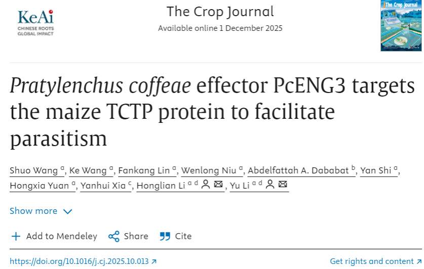 李洪连教授/李宇副教授课题组在中国科学院一区TOP期刊《The Crop Journal》发表了题为“Pratylenchus coffeae effector PcENG3 targets the maize TCTP protein to facilitate parasitism”的研究论文。该研究解析了咖啡短体线虫效应蛋白PcENG3直接靶向玉米肿瘤翻译控制蛋白ZmTCTP2a,抑制寄主抗病性并调控玉米根系细胞增殖分化和生长发育,通过“抗病抑制+组织重塑”双重策略促进线虫侵染寄生的分子机制。
