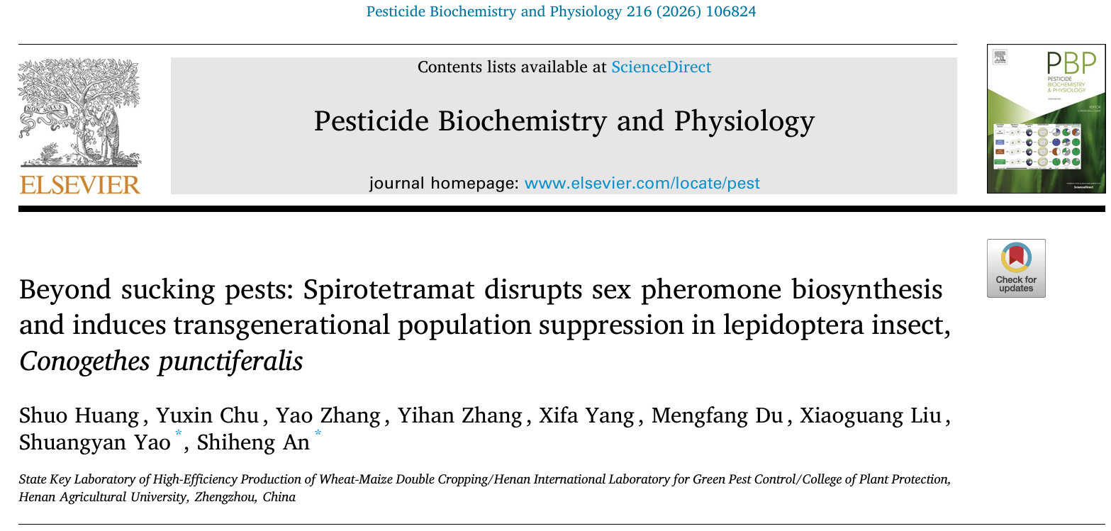 安世恒教授课题组在农药毒理学领域取得重要研究进展。该团队发现,常用于防治刺吸式害虫的杀虫剂“螺虫乙酯”,能够有效干扰重要农业害虫——桃蛀螟的性信息素合成,显著降低其交配成功率,并引发跨代生长抑制与种群衰退。该研究成果已在国际知名期刊《Pesticide Biochemistry and Physiology》发表,为桃蛀螟的绿色防控提供了全新思路。