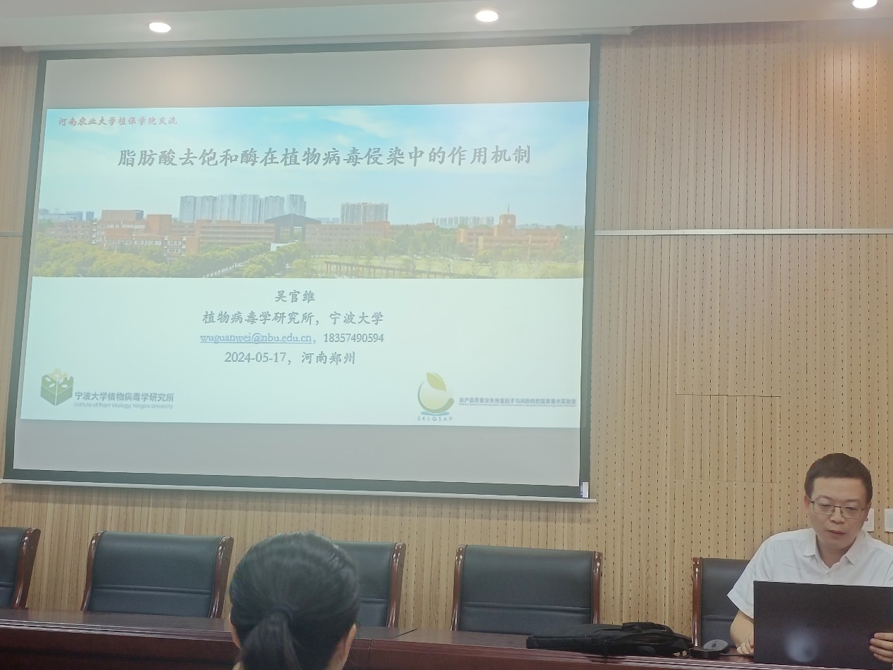 吴官维副研究员作题为“脂肪酸去饱和酶在植物病毒侵染中的作用机制” 的学术报告
