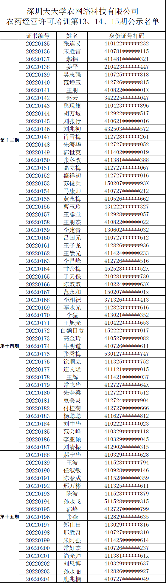 通过农药经许可56学时线上培训考核的人员名单公示(第13、14、15期)