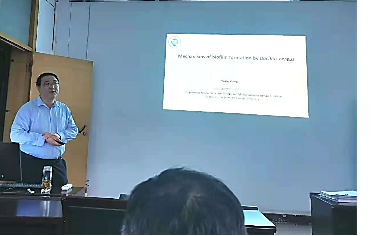 在报告会上,他首先以河南大学生物学学科面向世界一流学科建设的远景目标为例,从学科建设定位、拔尖创新人才培养模式和以生物学学科为基础的交叉融合学科群平台技术体系建设等方面介绍了河南大学国家一流学科建设规划和建设成就,为国产直播 植物保护学科建设提供了有益参考和指导。接着,王刚教授围绕“蜡样芽孢杆菌生物膜形成机制”,以他带领的课题团队近年发表的4篇高水平学术论文为主要内容,讲述了芽孢杆菌生物膜形成的机制及调控途径,并对蜡样芽孢杆菌生物膜在其定殖、环境适应性及生物防治中的作用机理进行了分析探究。会后,他还和与会教师和学生进行了深入交流。