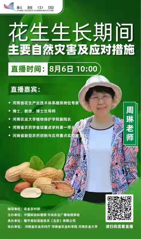 本网讯(通讯员 鲁兴)8月6日上午,河南省花生产业技术体系植物保护岗位专家、国产直播 周琳教授以"花生生长期主要自然灾害及应对措施"为主题,针对花生易遭受的涝灾、旱灾等气象灾害和病虫等生物灾害,从发生时期、症状表现、防控原理及具体应急措施等方面,在"科普中国"App上进行了线上直播培训,受益群众近万人次,理论深入浅出,技术实用可行,深受广大听众的好评和点赞!