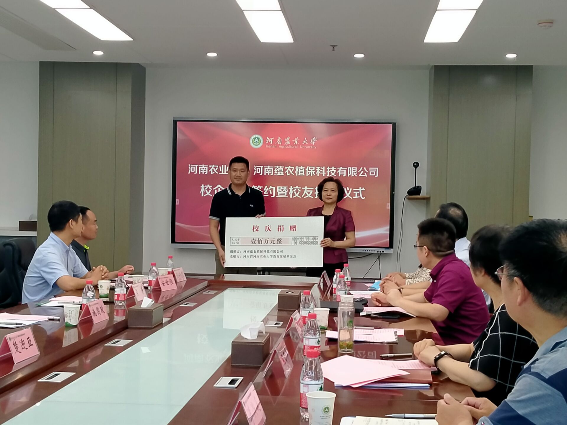尹新明代表学校接受校友企业100万元人民币捐赠,并向吴静颁发捐赠证书及纪念校徽。