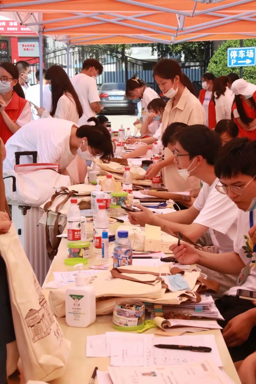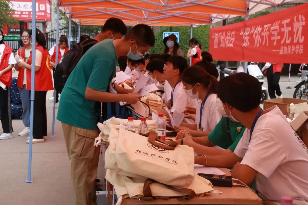 学院向每位新生发放学院定制的无纺布袋、入学指南、消毒凝胶、口罩以及太阳伞等物品。