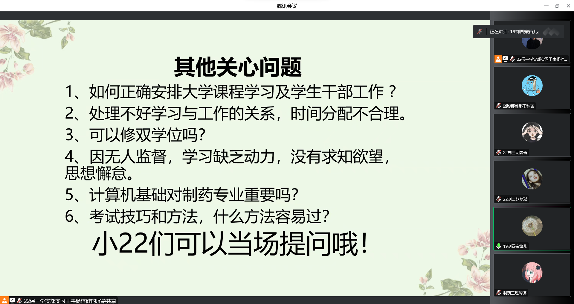 学生代表结合自身实际分享学习、生活经验、困难应对策略,探讨角色转变、学生组织对个人能力的提升,强调大家一定要有树立坚定的目标及矢志不渝的信念,鼓励大家在保障学习的前提之下,多参加社团活动全面提升个人综合素质。
