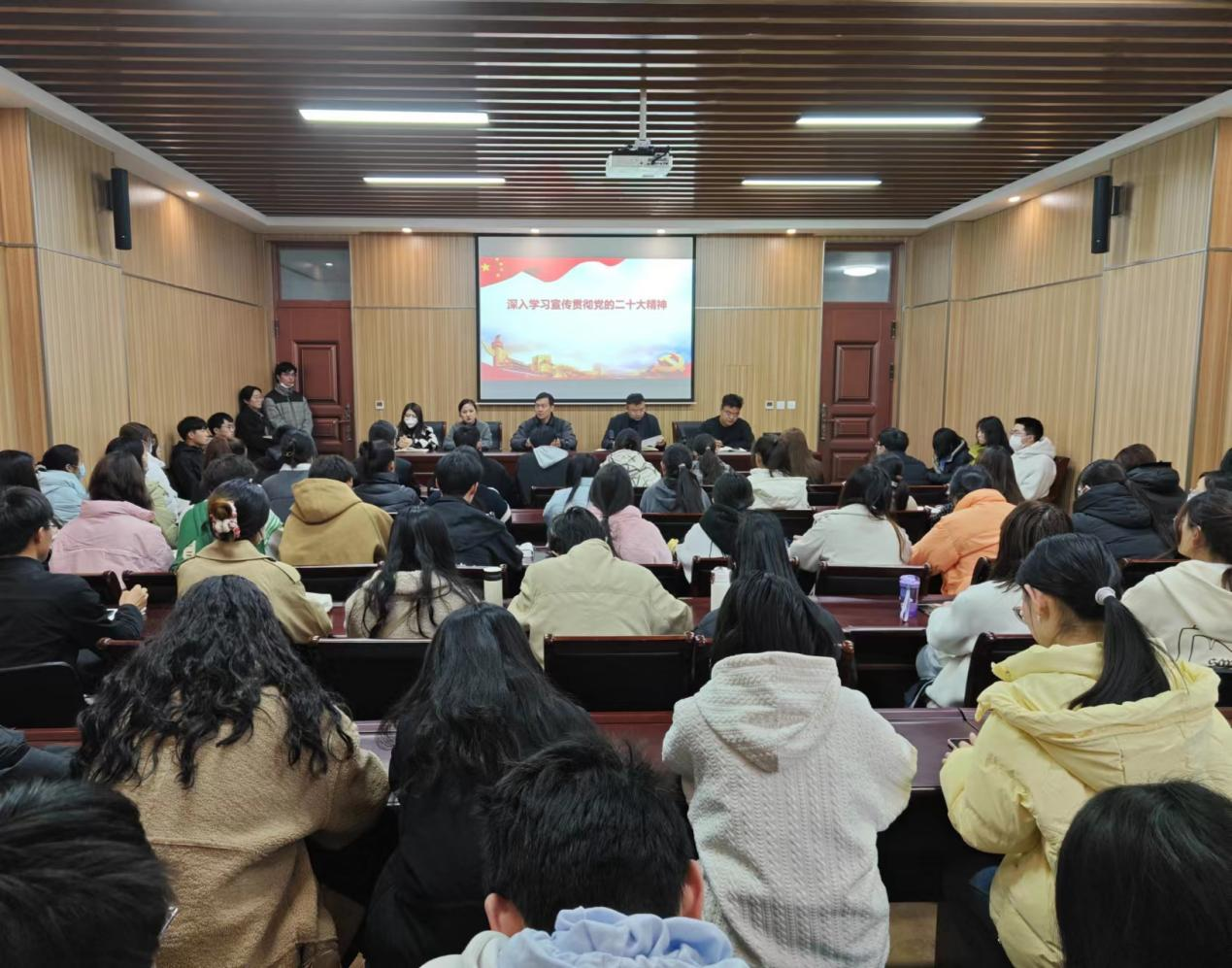 于龙子湖校区学院报告厅举办深入学习党的二十大精神报告会。院党委书记李兴道、院党委副书记鲁兴分别作了讲话,院团委书记黄姗姗主持会议,院团委副书记白瑜瑾、团委老师王赟飞以及全体学生干部参加会议。