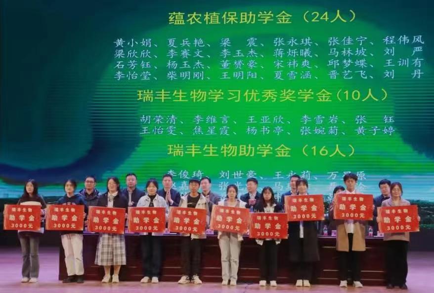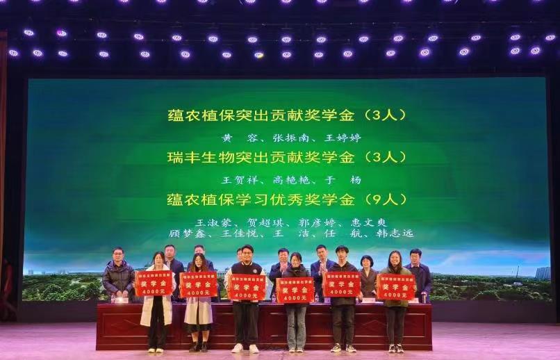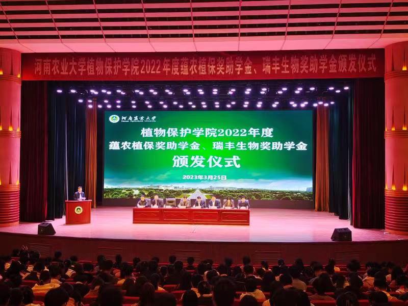 于文化路校区千人大礼堂举办2022年度蕴农植保、瑞丰生物奖助学金颁发仪式。河南蕴农植保科技有限公司董事长吴静、广州瑞丰生物科技有限公司董事长李慎磊、校友办主任胡明忠及院领导班子成员出席颁奖仪式。仪式由院党委副书记鲁兴主持。