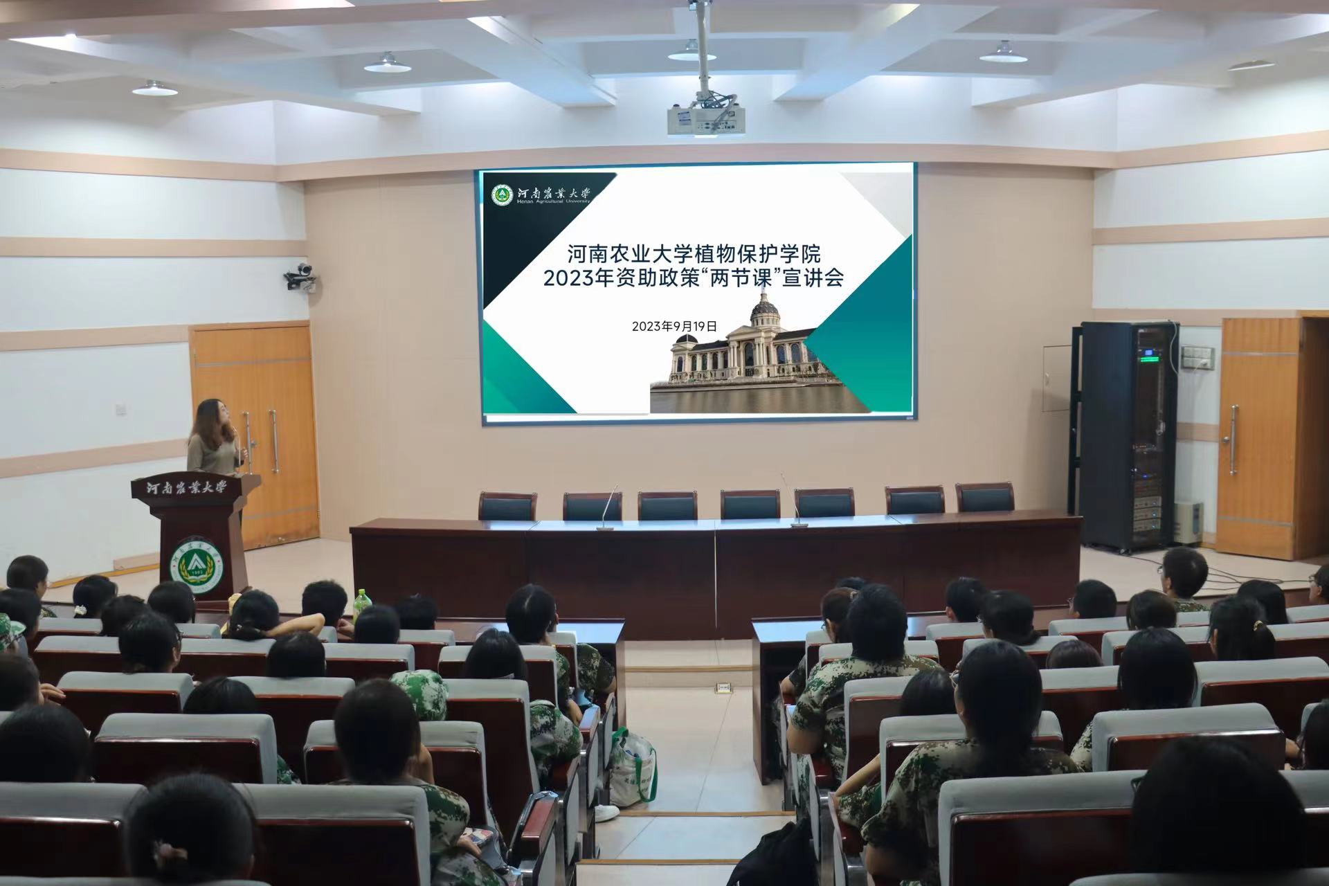 于文化路校区三百人报告厅举行2023年资助政策“两节课”宣讲会。2023级全体新生参加会议,会议由团委学贷部何紫馨主持。