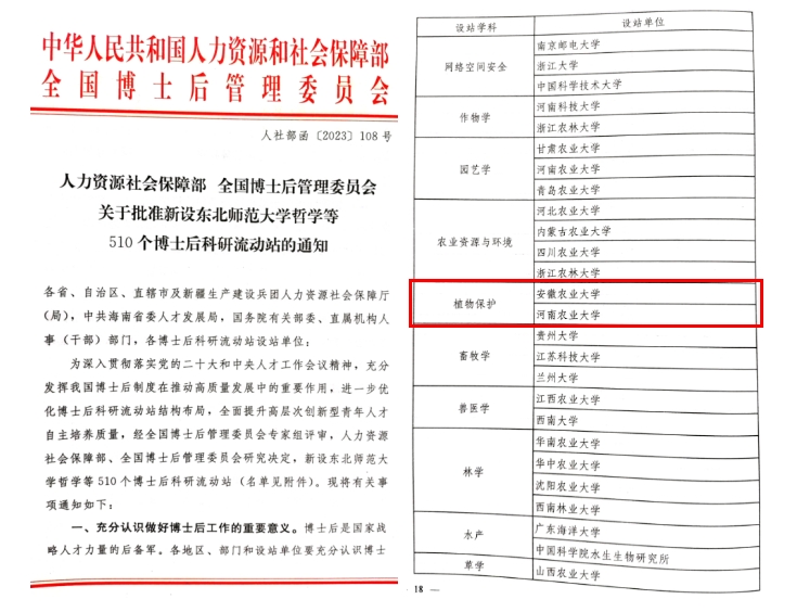 近日,人力资源社会保障部、全国博士后管理委员会联合下发《关于批准设立东北师范大学哲学等510个博士后科研流动站的通知》(人社部函〔2023〕108号),国产直播 申报的“植物保护”学科博士后科研流动站获批设立。