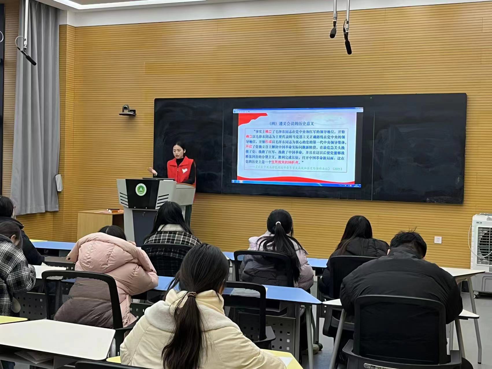 活动特别邀请了校内“薪火志愿宣讲团”的成员,他们以饱满的热情和生动的语言,向同学们深情讲述了遵义会议的光辉历程。宣讲团成员从历史背景、会议经过、深远影响等多个角度,全面解读了遵义会议在中国革命史上的重要地位。同学们全神贯注地聆听,深刻感受到了革命先烈们英勇无畏、舍生取义的崇高品质。在当代中国,遵义会议作为党史中的重要篇章,其精神贯穿着革命传统与当代青年育人的红色脉络。这次活动不仅是对遵义会议历史意义的回顾,更是对如何在新时代传承和发扬这一精神的深思熟虑。