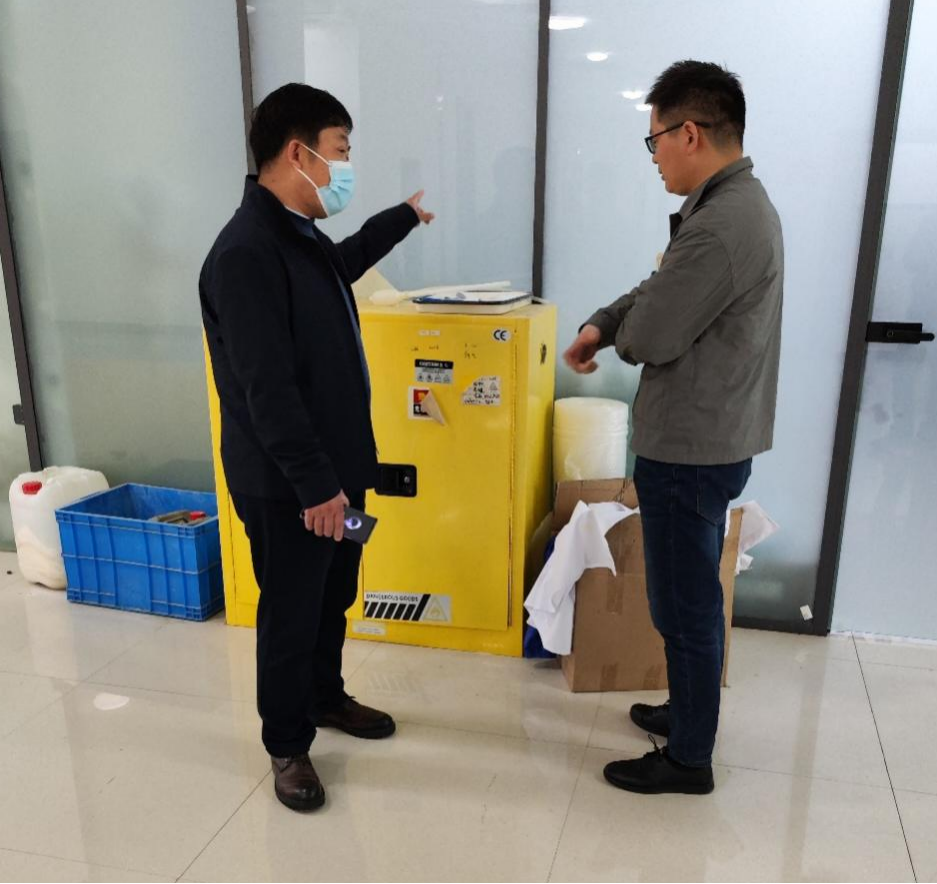 曲岩带领检查人员对每间实验室进行了地毯式无死角的检查,重点对危化品管理、高温高压仪器使用登记规范性、消防隐患等问题进行了查验。学院整体实验室安全管理比前期有了明显的提高,但是也存在一些药品使用登记不规范、杂物堆放不整齐等问题。检查组对暴露出的相关问题进行及时告知对应,现场或限期整改,记录备案。