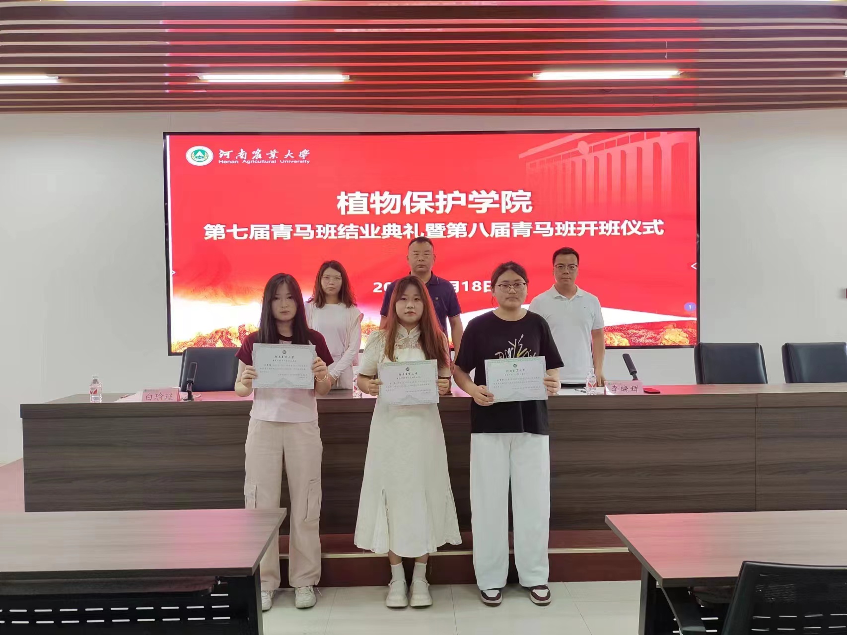 于龙子湖校区第二实验楼六楼会议室举行第七届青马班结业典礼暨第八届青马班开班仪式。院党委副书记鲁兴、团委副书记白瑜瑾、组织员李晓辉及第七届、第八届青马班学员参加仪式。仪式由李晓辉主持。