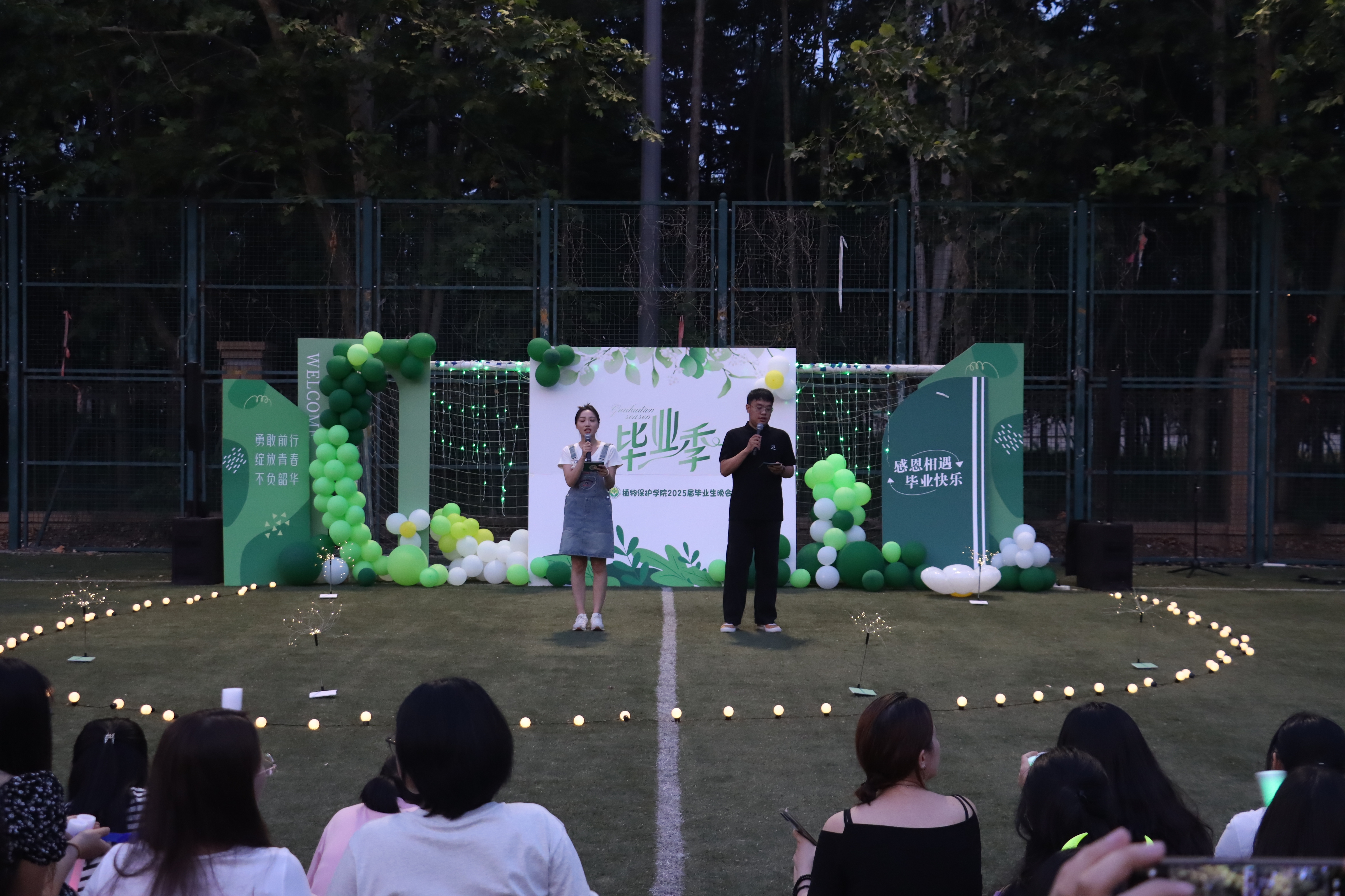 2025届毕业晚会在此温情上演。毕业生们齐聚绿茵场,在夏夜微风中共同见证这场属于青春的盛大告别。晚会由毕业生辅导员王赟飞和2025届本科毕业生李晓玲主持。