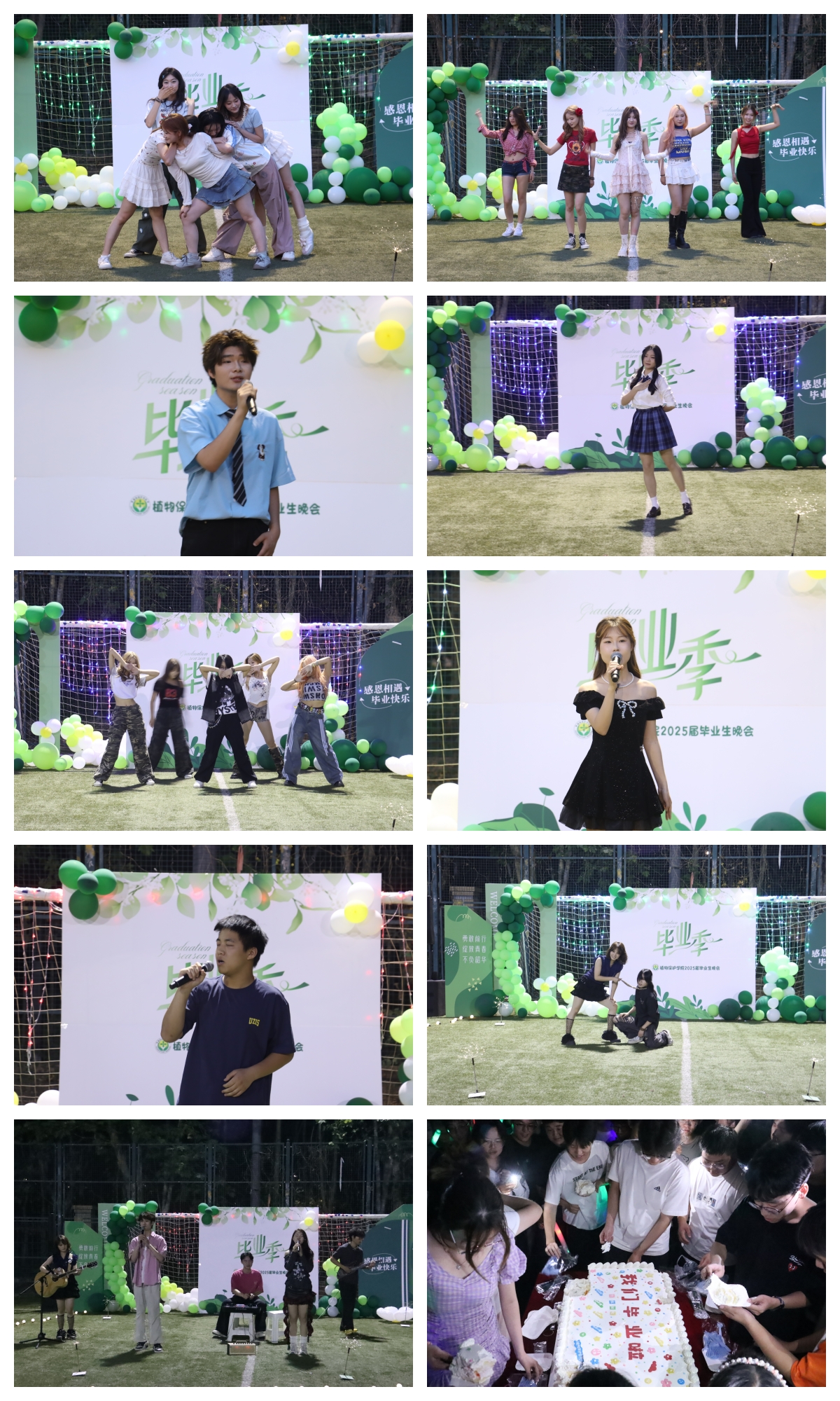 以艺载道诉别情。当《Bite Me》与《咆哮》的接连登场,荧光棒的海洋随节奏翻涌,将晚会推向首个高潮。《红色高跟鞋》的慵懒爵士与《红豆》的经典重现形成绝妙呼应,为狂欢之夜注入细腻情感。压轴舞蹈《Replay》再次炸裂全场。在终曲《半句再见》的旋律中,同学们自发打开手机闪光灯,足球场化作一片星海。晚会尾声,学院为2025届毕业生定制的毕业蛋糕缓缓推出,甜蜜的分享仪式中,镜头定格下一张张盈满笑意的脸庞。