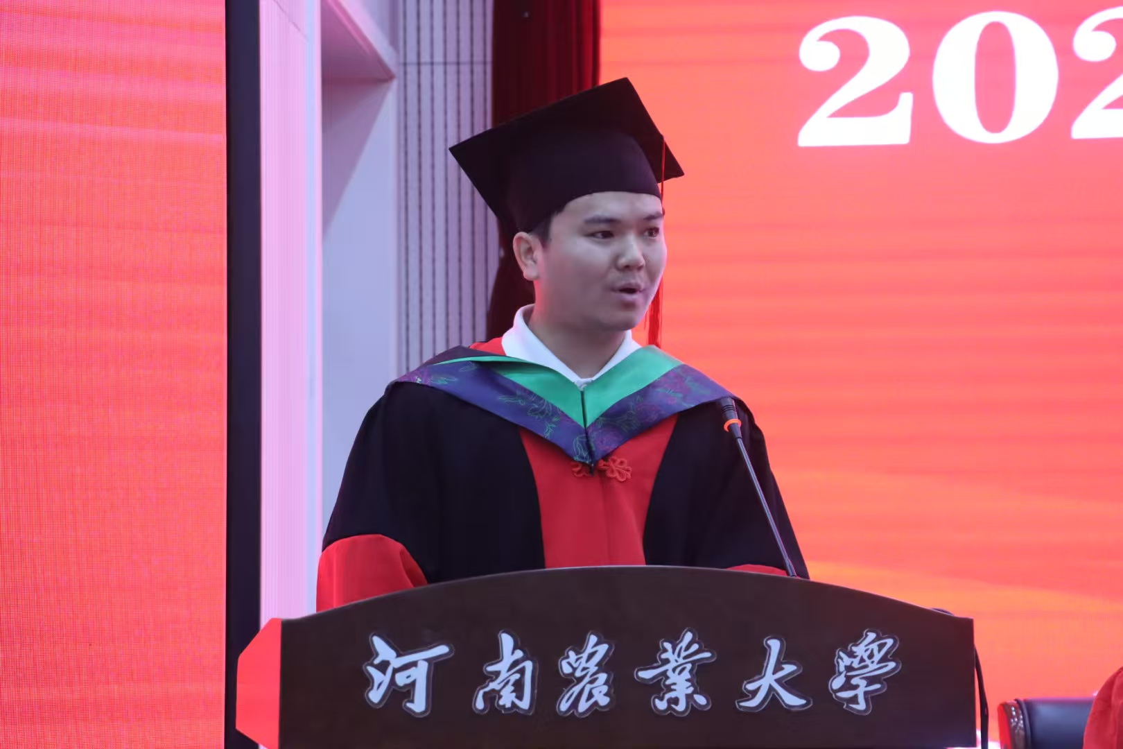 2021级制药工程专业四班刘恋作为本科生代表上台发言,她讲述了自己与农大的故事,并向悉心栽培、倾付关怀的师长致以最深切的感恩,向并肩奋斗、携手同行的同窗献上最美好的祝愿,立志以青春为笔、以实干为墨,在新时代的广阔天地中勇做攻坚克难、开拓创新的“追梦奋斗者”,于祖国发展浪潮中书写使命担当,为民族复兴伟业贡献磅礴力量。
