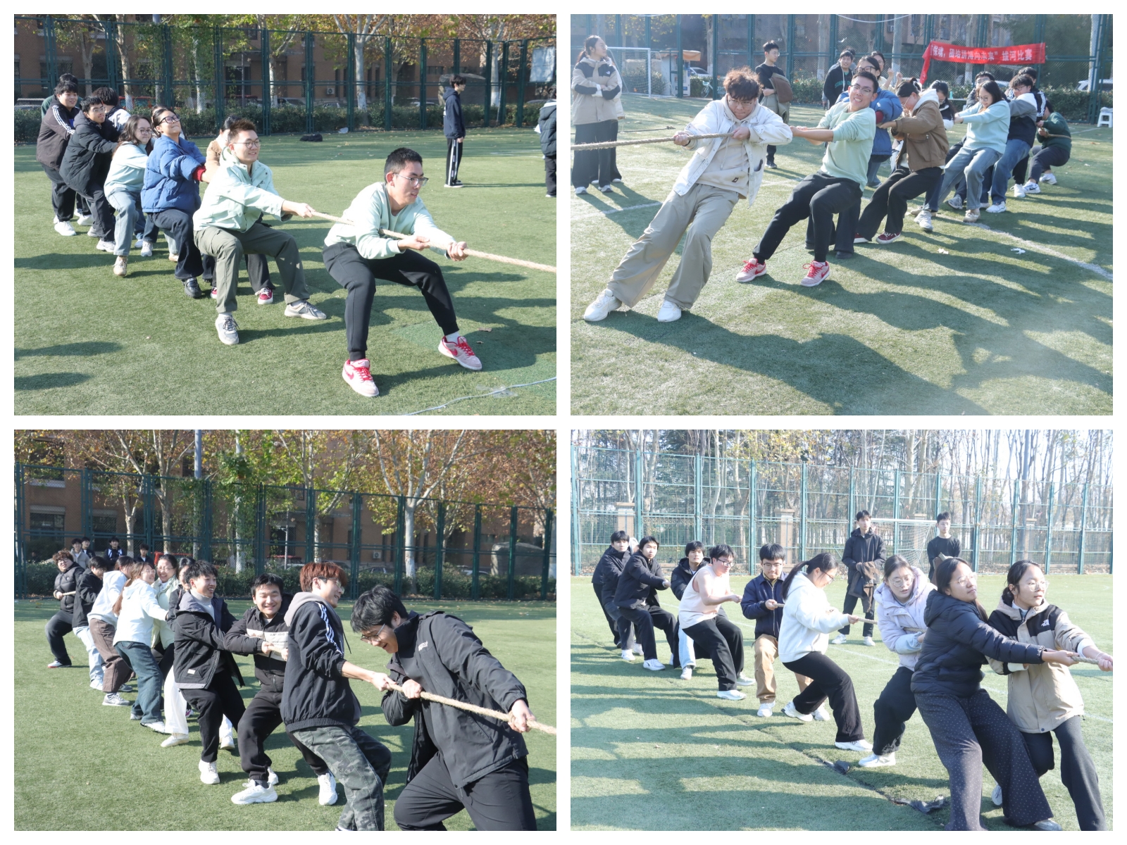 随着裁判员的一声哨响,比赛正式拉开帷幕。参赛队员们脚蹬实地、弓步稳扎,紧握长绳的双手青筋暴起,身体后倾形成整齐划一的坚韧防线。“一二、一二”的号声铿锵有力,与场边观众的呐喊助威声交织回荡,将赛场氛围一次次推向高潮。各队伍凭借默契配合与顽强韧劲,展现出植保学子不服输、不放弃的拼搏姿态。